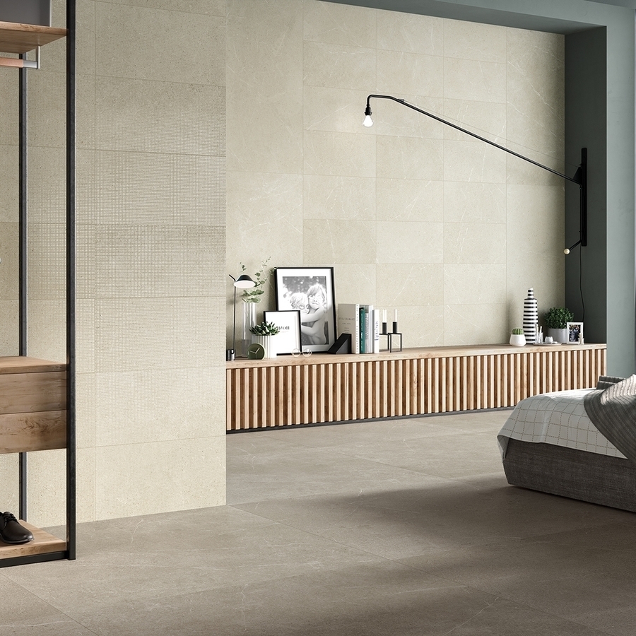 Available in three different colours, Fabriano III Full Body porcelain embellishes any room with a stone effect filled with patterns.