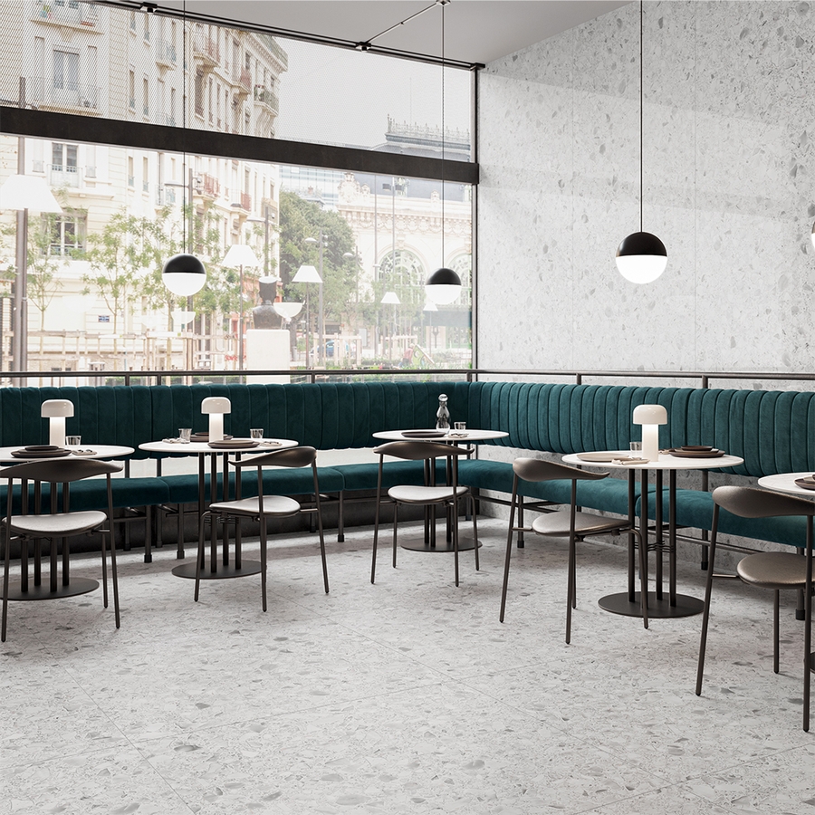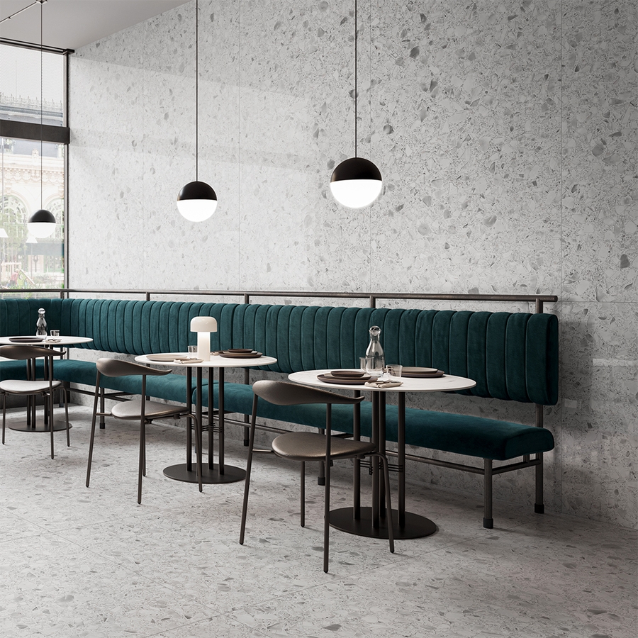 Pioltello Poli stands out for its incredible terrazzo effect. Made in Italy, this colored body porcelain ceramic honors the traditional terrazzo, which is made from tinted cement mixed with elements such as granite, glass, or marble. Unique in its kind, its design creates the illusion of a cluster of water droplets gathered, resulting in an exceptional visual.