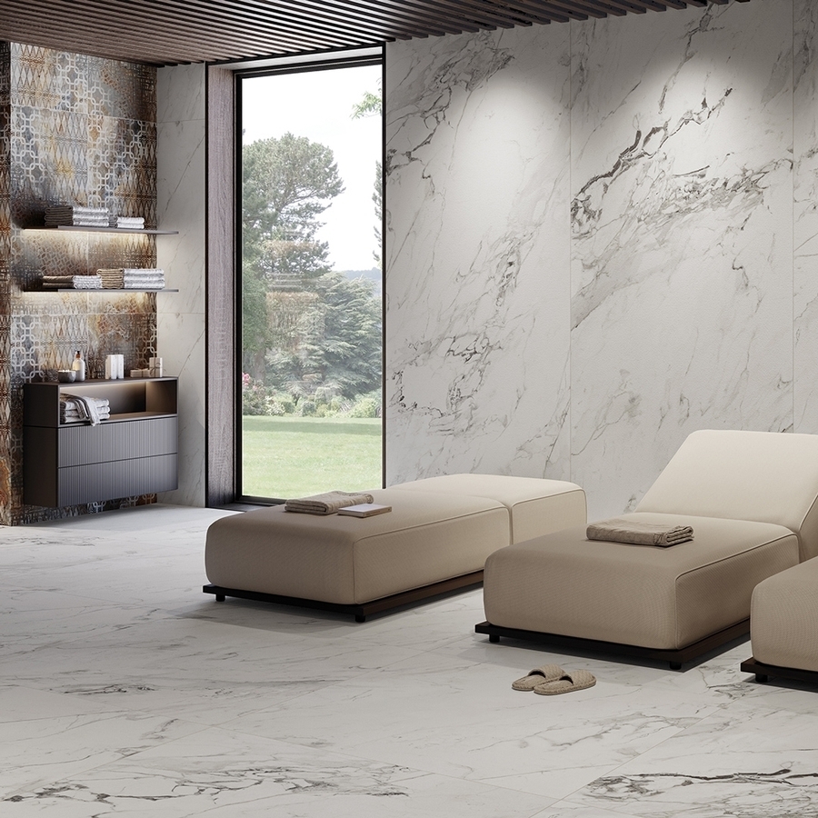 The contemporary Briona ceramic is ideal for those seeking a sleek, durable, and easy-to-maintain design. The fluid and natural appearance of a flowing stream, with neutral tones and transparent effects, makes it suitable for both walls and floors.